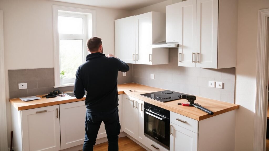 Snickaren riktar upp väggarna och börjar montera köksskåpen och stommarna. Därefter installeras diskho och bänkskiva. Har du beställt en bänkskiva i sten mäts denna ofta upp först när stommarna är på plats, vilket kan innebära en kort paus i renoveringen.